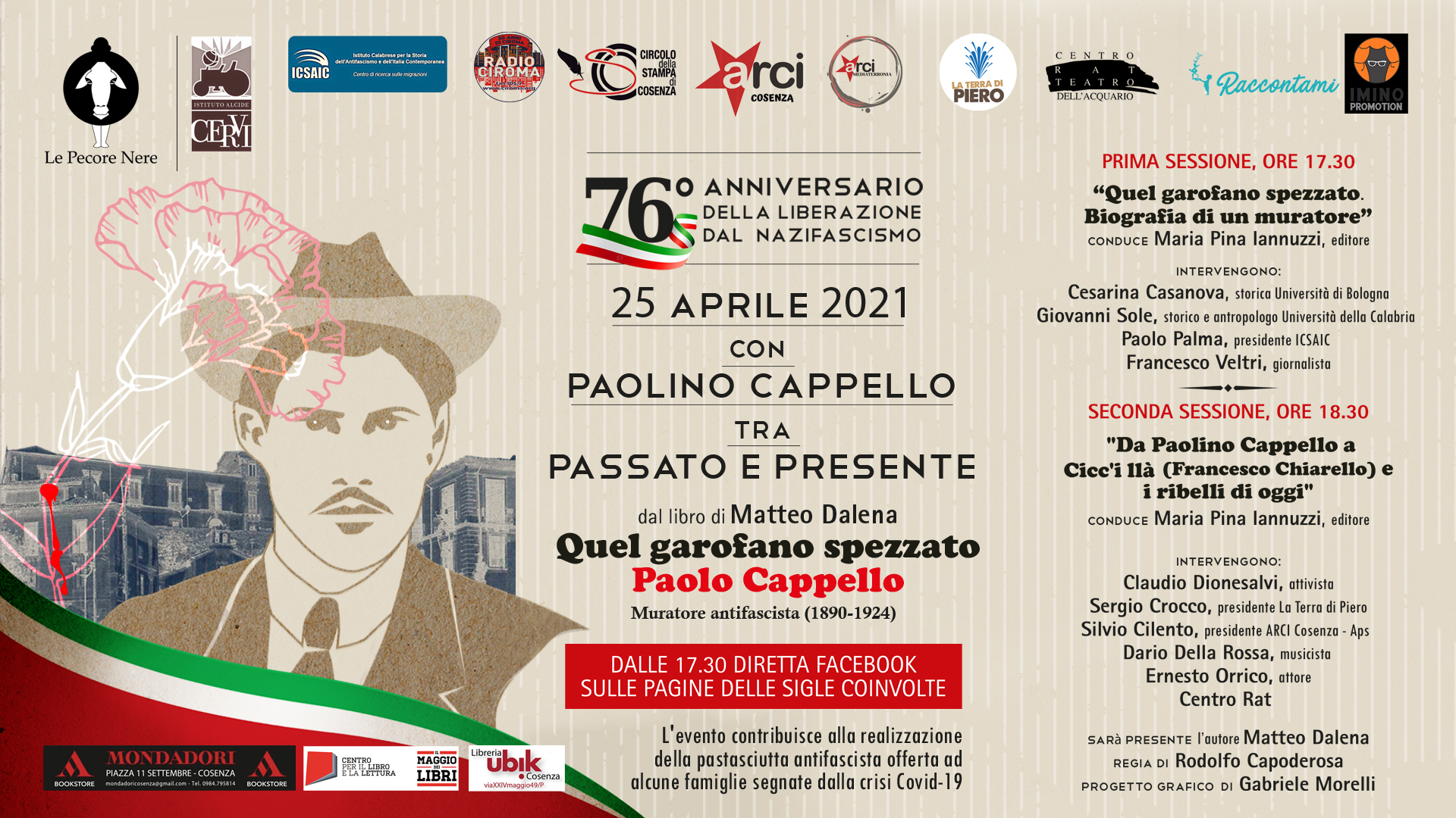 Si svolgerà il prossimo 25 aprile, 76 ° anniversario della Liberazione dal nazifascismo, la prima presentazione del volume “Quel garofano spezzato. Paolo Cappello, muratore antifascista (1890-1924)” del giornalista e storico Matteo Dalena, edito da Le Pecore Nere. Il volume, frutto di una lunga ricerca negli Archivi di Stato di Cosenza e Centrale dello Stato di Roma, sarà presentato con una diretta su facebook che sarà condivisa dalle numerose associazioni che hanno collaborato all’evento. Moderata dall’editore Maria Pina Iannuzzi, la presentazione si svolgerà in due, diverse sessioni. Alla prima, che avrà inizio alle 17.30, interverranno la storica dell’Università di Bologna, Cesarina Casanova, lo storico e antropologo Giovanni Sole che ha curato la prefazione al testo, il giornalista Francesco Veltri e il presidente dell’ICSAIC, Paolo Palma, che ne ha curato l’introduzione. La seconda sessione avrà inizio alle 18.30 e vedrà una serie di interventi di attivisti e artisti (Claudio Dionesalvi, Sergio Crocco, Silvio Cilento, Dario Della Rossa, Ernesto Orrico, e il Centro Rat) che discuteranno sulle nuove forme di resistenza, a partire dall’esempio del muratore antifascista.