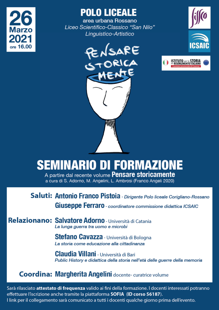 Venerdì 26 marzo, alle ore 16, si terrà il seminario di formazione “Pensare storicamente”, organizzato dal Polo liceale “San Nilo” di Rossano. L’iniziativa, che l’ICSAIC ha patrocinato, si inserisce nell’ambito delle attività portate avanti dalla Commissione didattica dell’Istituto, impegnata ad avvicinare allo studio della Storia i giovani delle scuole calabresi.