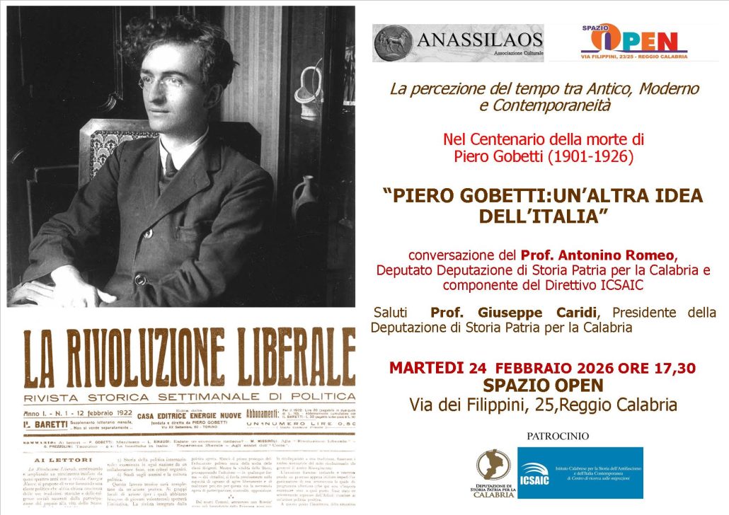 L’incontro, dal titolo “Piero Gobetti: un’altra idea dell’Italia”, vedrà la partecipazione del Prof. Antonino Romeo, Deputato della Deputazione di Storia Patria per la Calabria e componente del Direttivo ICSAIC, che proporrà una conversazione dedicata all’attualità del pensiero gobettiano, alla sua visione del liberalismo e al ruolo della rivista La Rivoluzione Liberale nel dibattito politico e culturale dell’epoca.